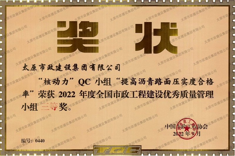 2022年度全國市政工程建設(shè)優(yōu)秀質(zhì)量管理小組三等獎(jiǎng)_''核動(dòng)力QC小組”提高瀝青路面壓實(shí)度合格率”